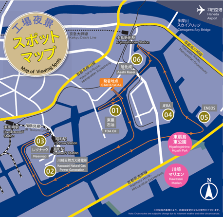 这是一趟游船之旅,将带您游览川崎港内的盐滨运河、田边运河和南渡运河等多条运河,同时欣赏川崎工厂的夜景。