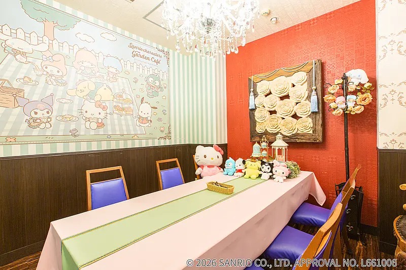 咖啡廳內,您可以一邊品嚐美食和甜點,一邊欣賞身著原創服裝的三麗鷗角色(*)。此外,咖啡廳還設有沙發座位、VIP包廂、拍照區和周邊商品銷售區,使其成為不僅是休閒咖啡廳,更是舉辦粉絲活動和紀念活動的理想場所。
